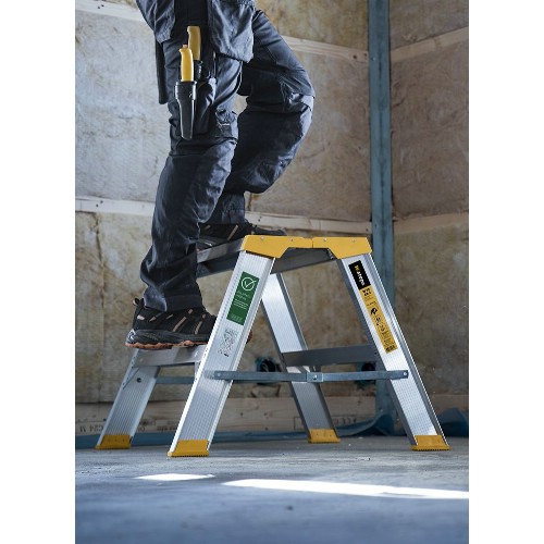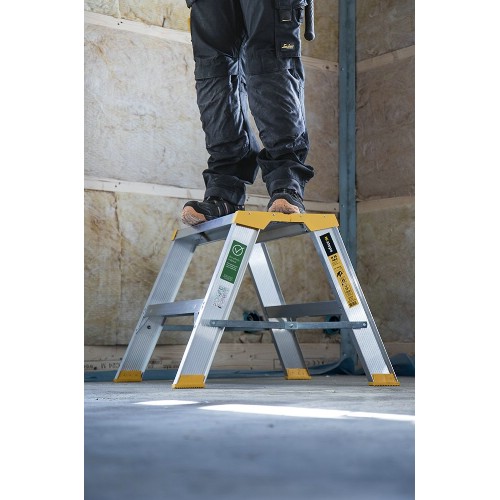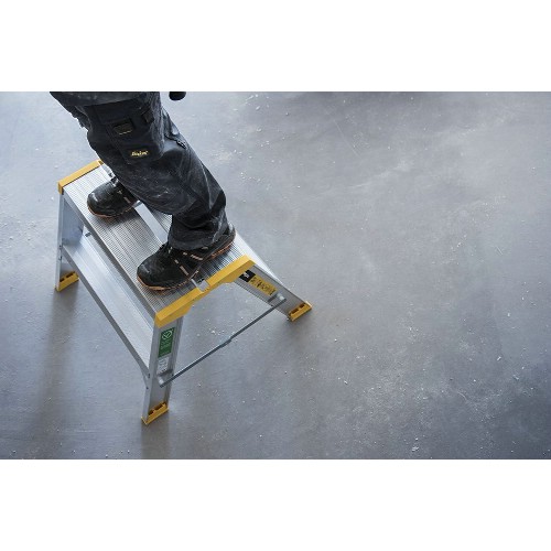 Stabil och säker arbetsbock som klarar höga påfrestningar och daglig användning. Stor topplatta 300x600 mm. Utrustad med 80 mm djupa och räfflade fotsteg. Kraftig aluminiumprofil ger stabilitet utan att göra arbetsbocken tung. Två rejäla stag låser arbetsbocken när den är utfälld och gör den extra stabil. Topplatta med ändskydd i plast.